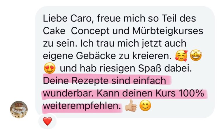 Durch Caros Unterstützung fühle ich mich sicher z.B. Rezepte einfach zu halbieren und habe insgesamt viel Sicherheit beim Backen meiner Torten.